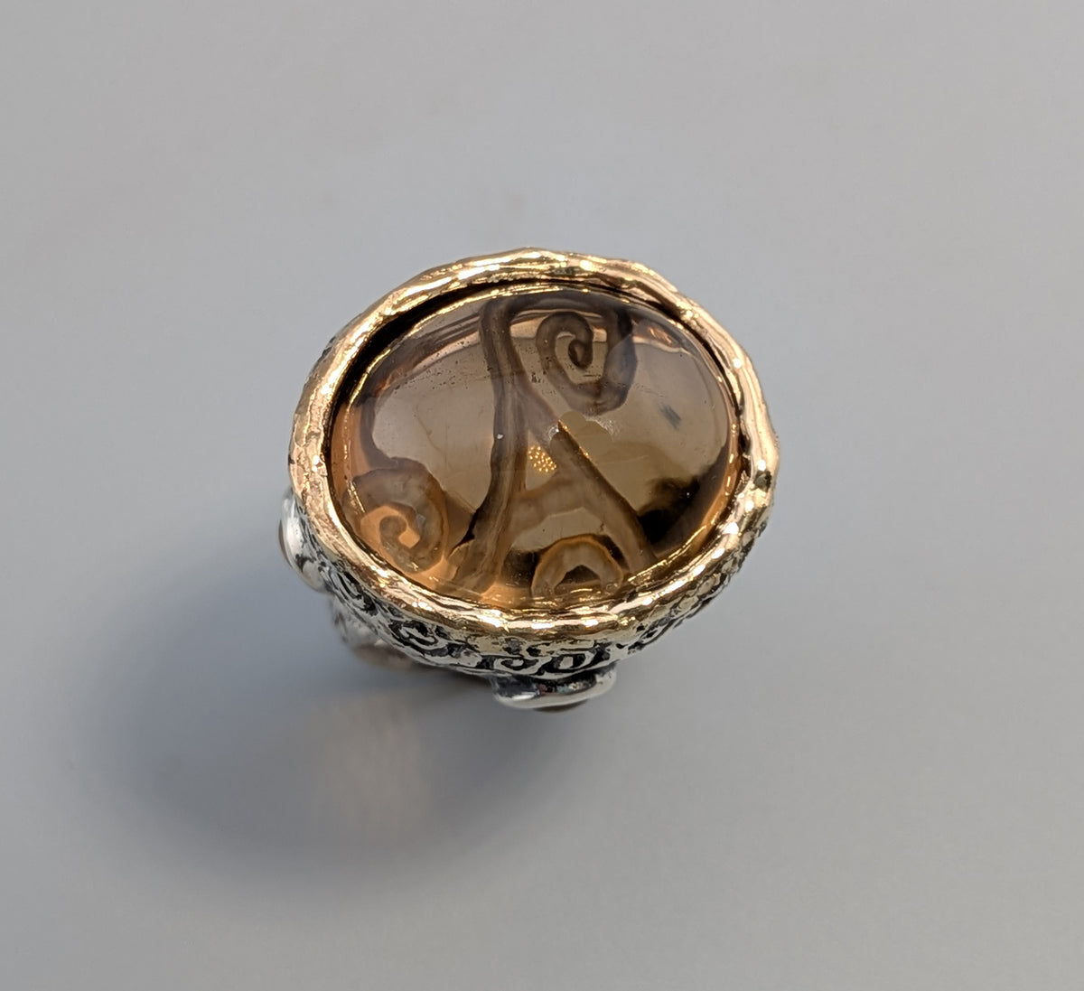 Carved Smoky Quartz Sterling Silver Ring with 14kt Gold Bezel