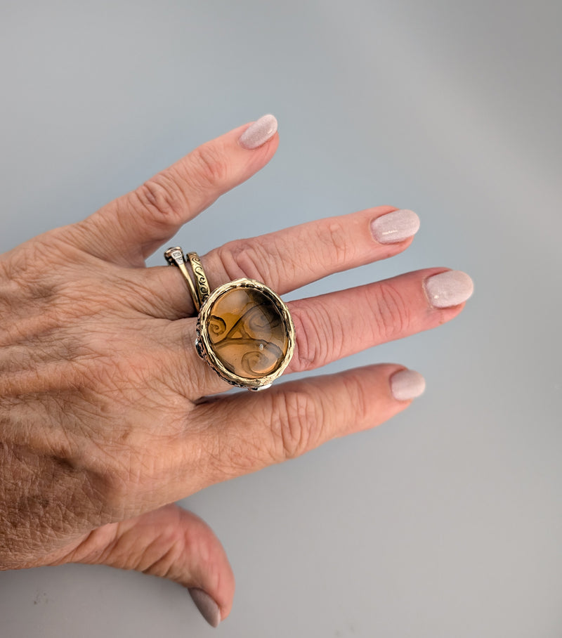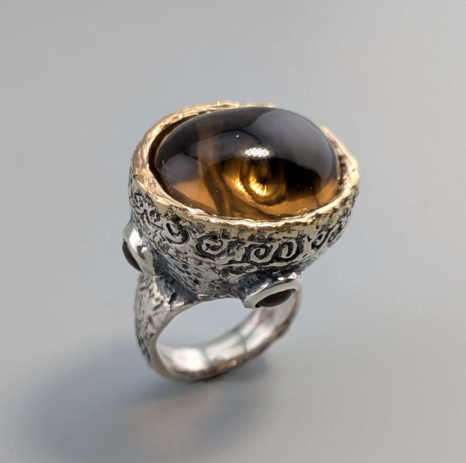 Carved smoky quartz set in sterling silver ring with 14kt gold bezel  and 4 citrine cabochons around