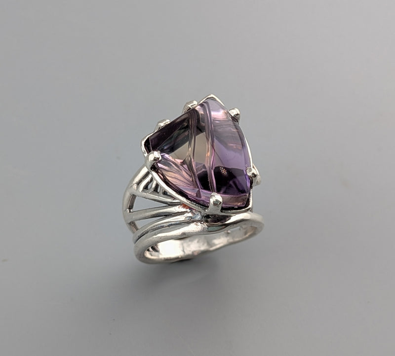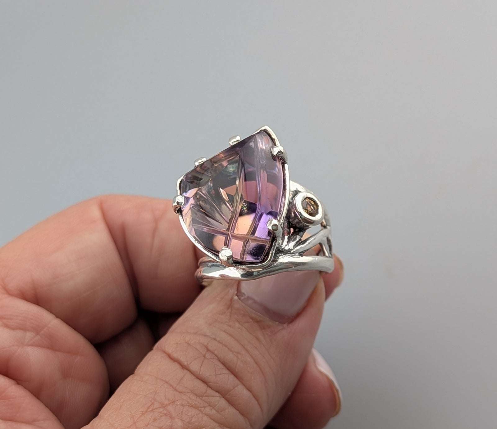 Fancy cut ametrine set in sterling silver ring with one golden sapphire on side.
