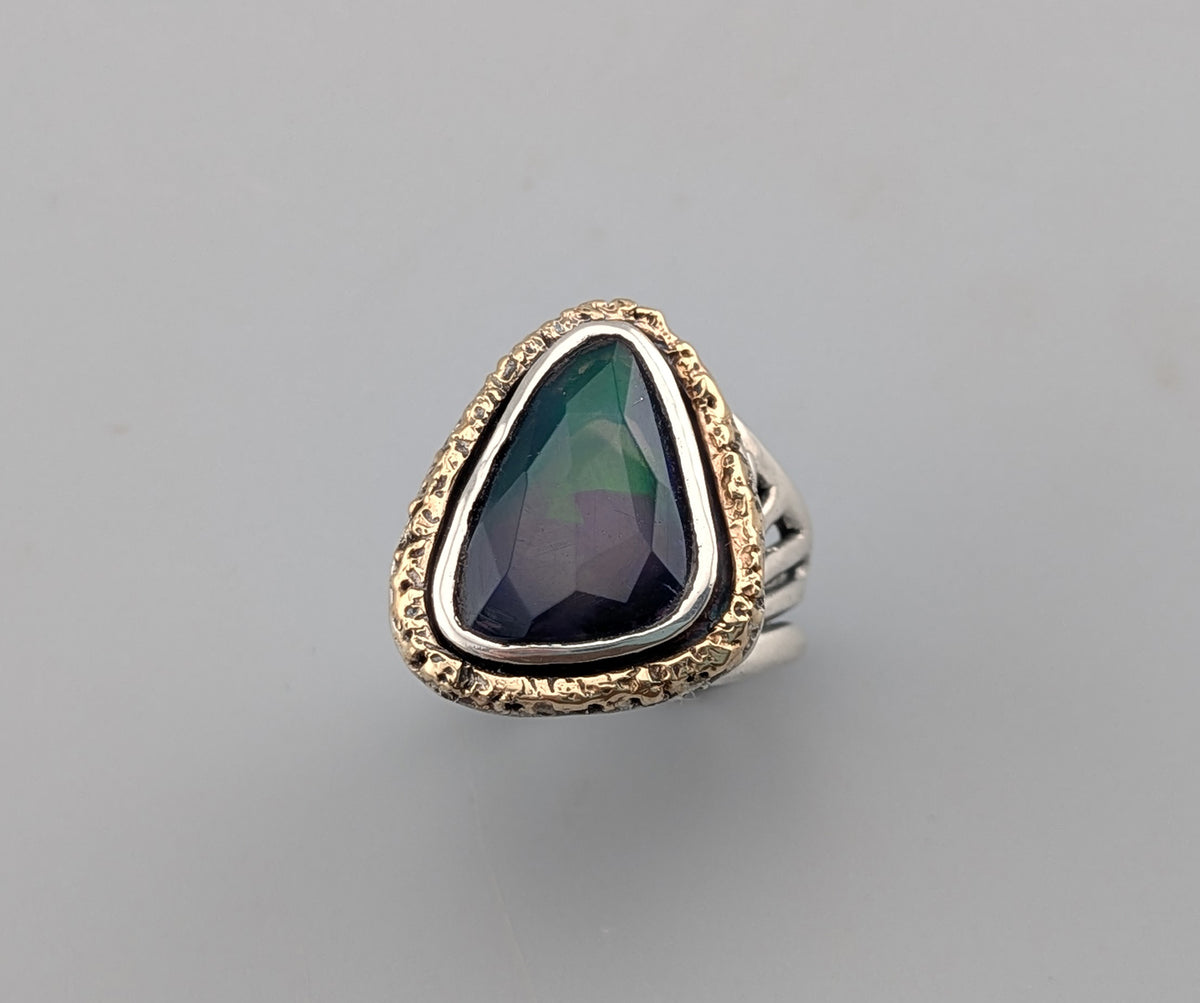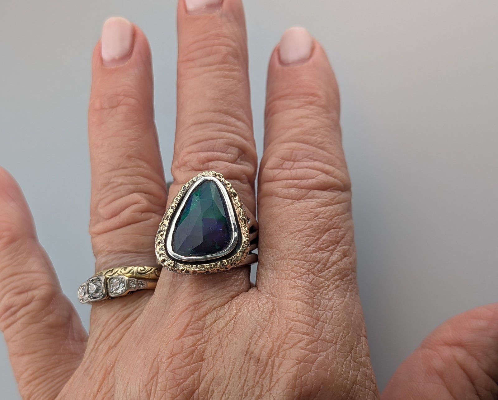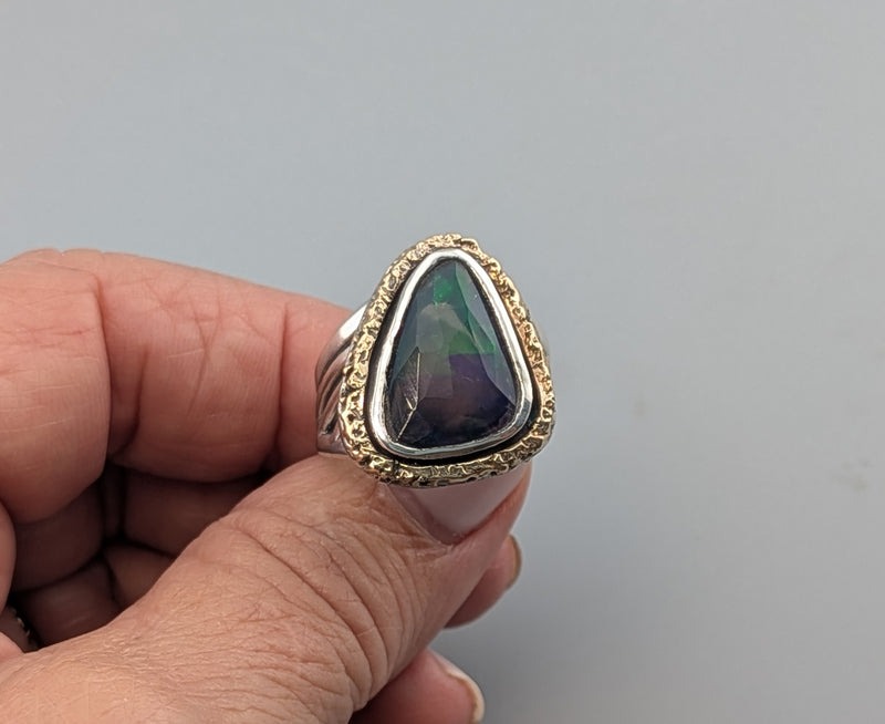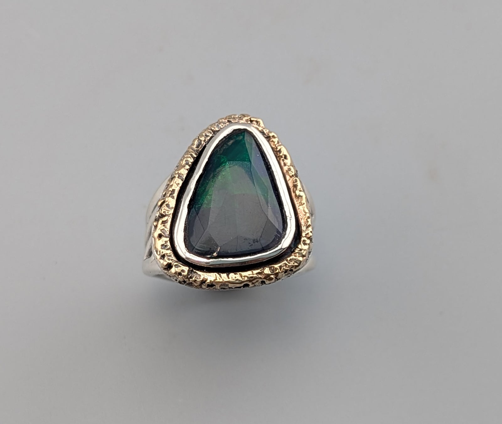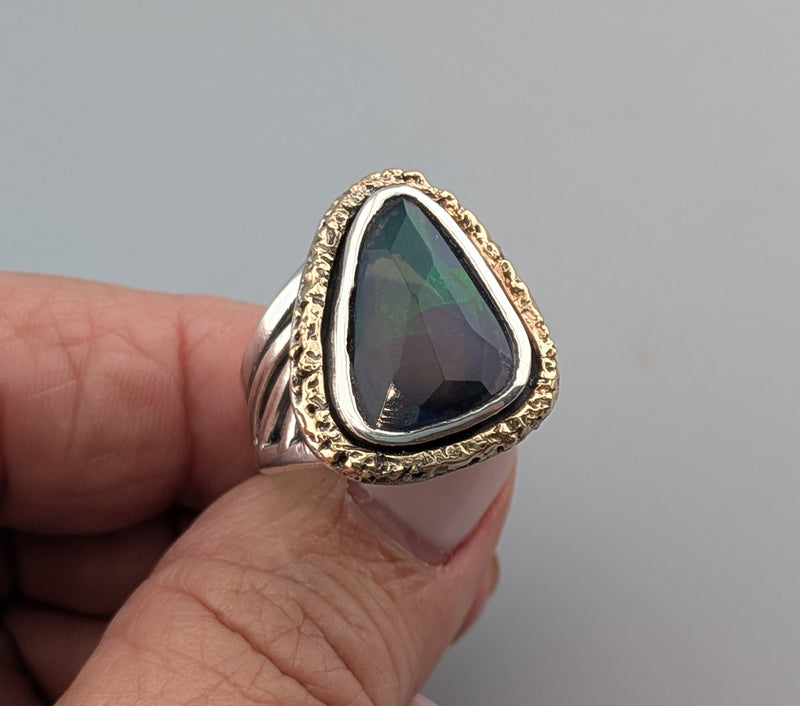 Smoked Ethiopian opal set in sterling silver and 14kt gold ring.